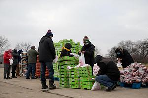 Hundreds of cars line up before dawn on weekly distribution days for the Forgotten Harvest's partner food pantries in...
